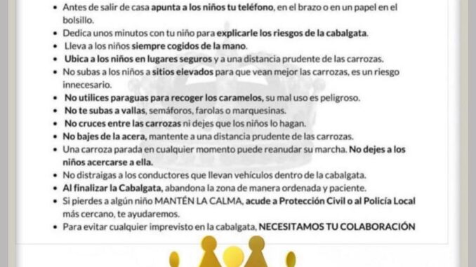 Se recomienda permanecer siempre en la acera. No rebasar las vallas ni las cintas de baliza. No cruzar delante de las carrozas. No subir al mobiliario urbano. Seguir las indicaciones de la Policía Local y de Protección Civil, según la Policía Local y Protección Civil.